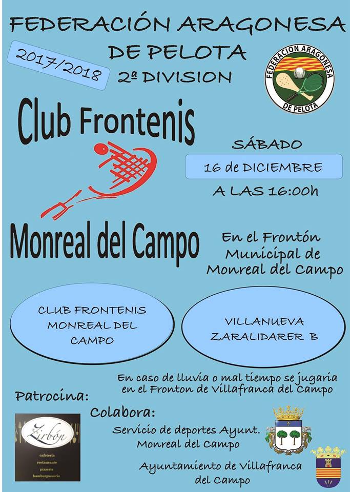 06 Diciembre 2017 Noticias de portada Jornada de frontenis el próximo sábado en Monreal del Campo En MONREAL del Campo nueva jornada de frontenis el próximo sábado. En el frontón Municipal a las 16:00 contra Villanueva. Anterior